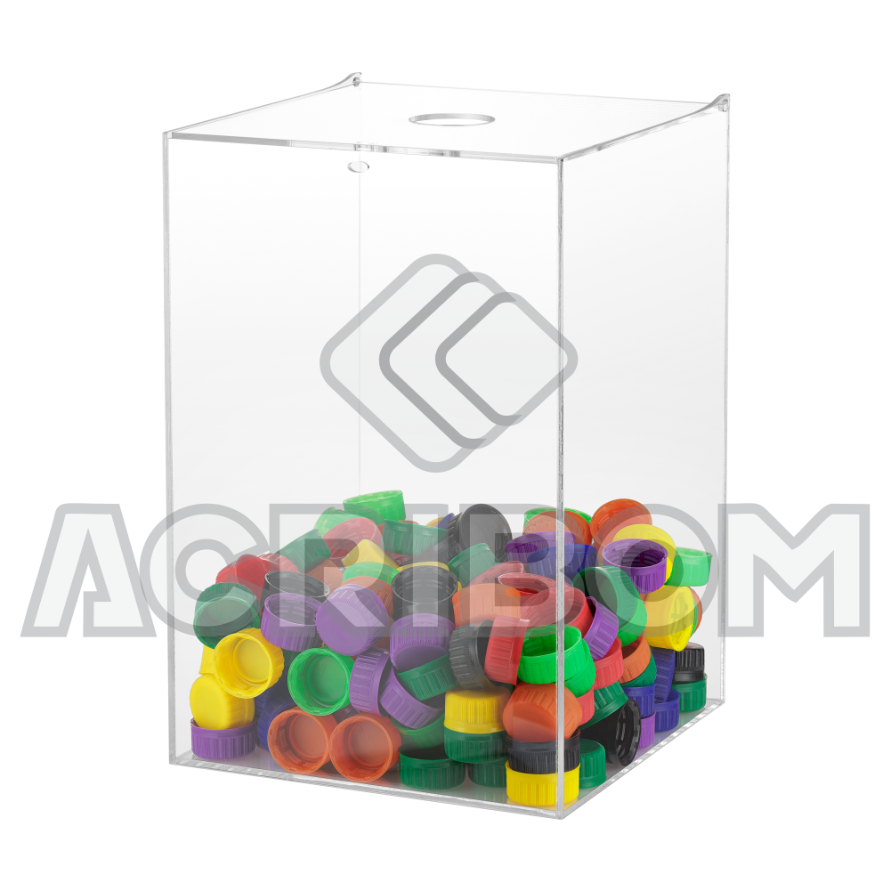 Caixa de parede ou balcão para lacres de latas e/ou tampinhas de garrafa de garrafa. Produzida em acrílico transparente com tampa articulada e furos para utilização de lacres de segurança.
