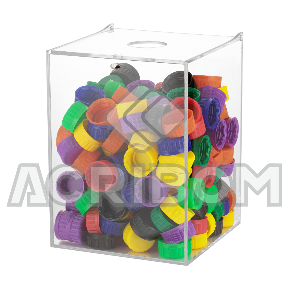 Caixa de parede ou balcão para lacres de latas e/ou tampinhas de garrafa de garrafa. Produzida em acrílico transparente com tampa articulada e furos para utilização de lacres de segurança.
