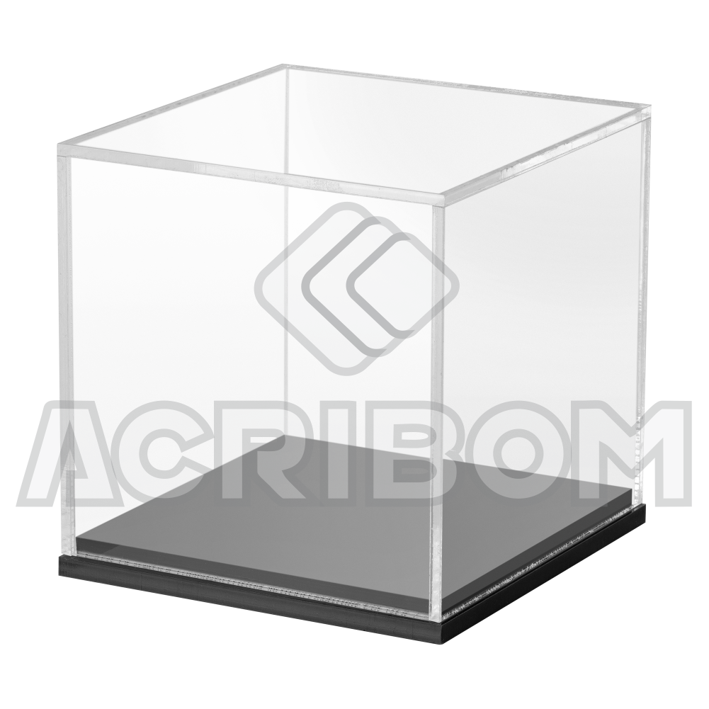 Cúpula de acrílico transparente com base preta para exposição de objetos. Produzida em acrílico virgem no formato QUADRADO e com base para encaixe da cúpula.