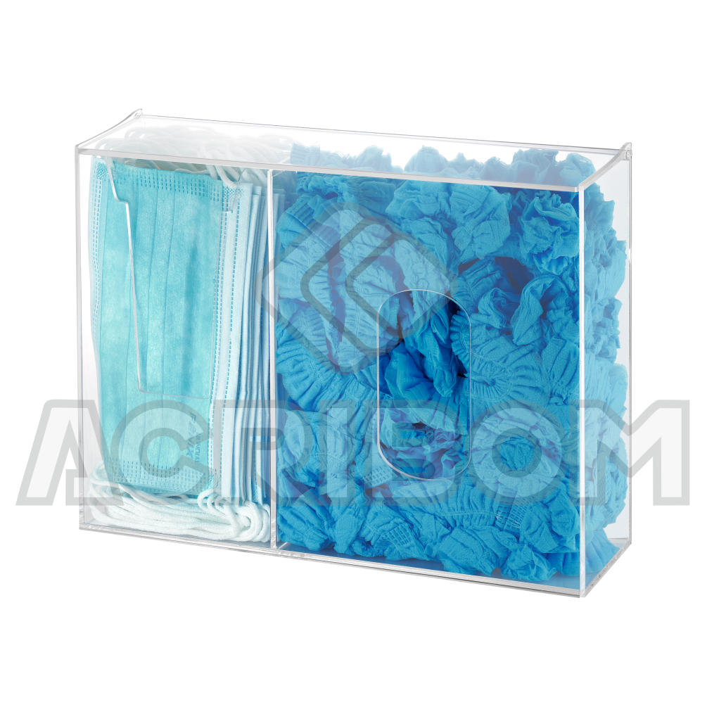 Suporte tipo dispenser para descartáveis DUPLO com compartimentos para TOUCAS e MÁSCARAS.