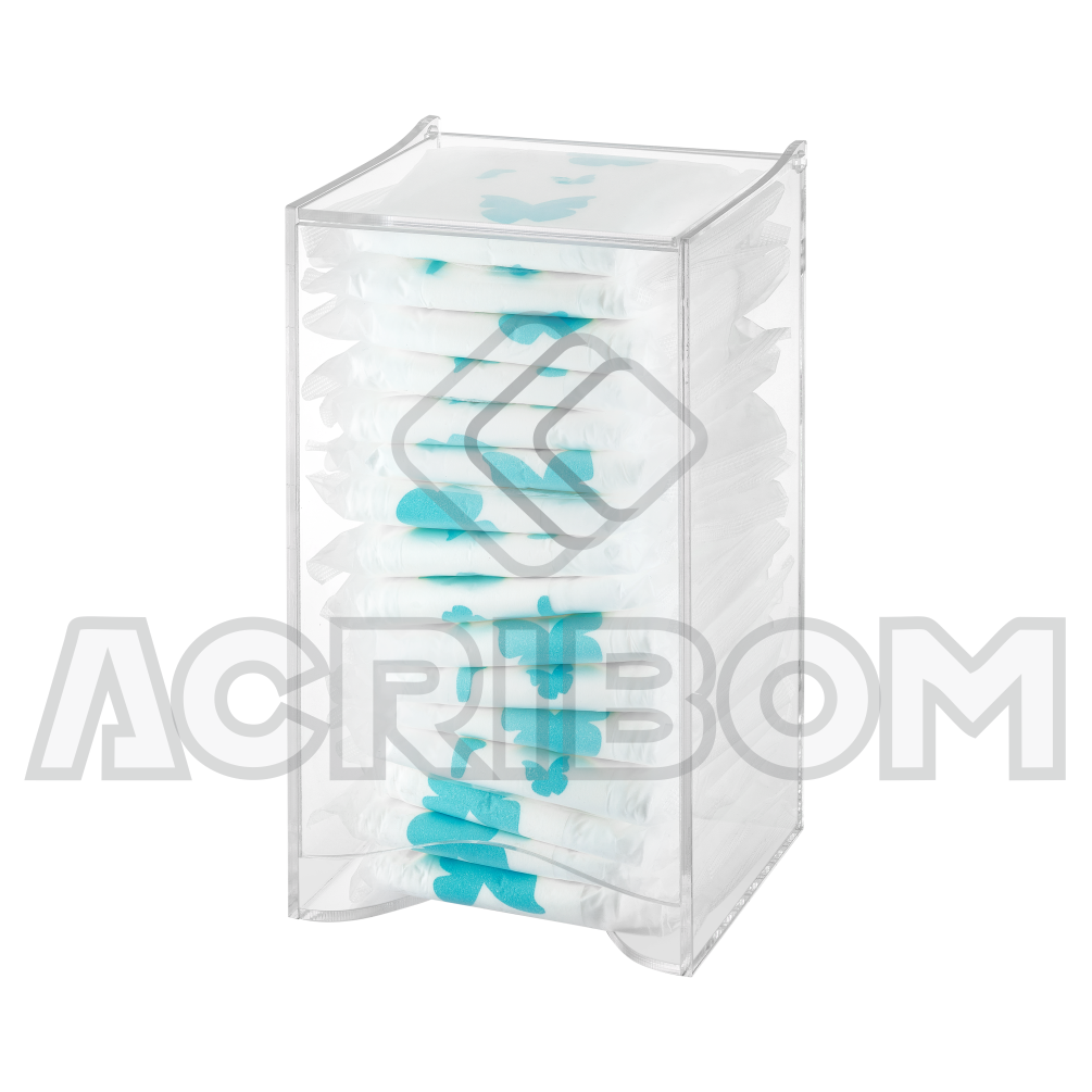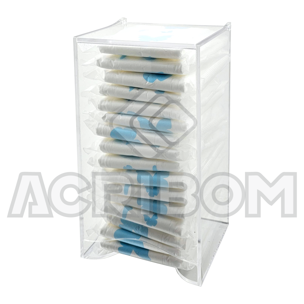 Dispenser de parede em acrílico para absorventes com tampa articulada e saída anatômica. Fixação por parafusos.