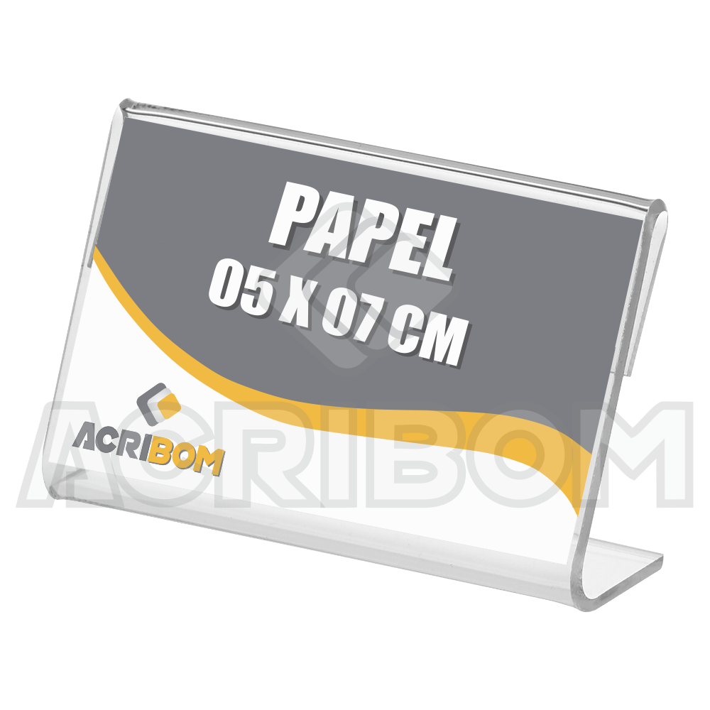 Porta etiqueta, ou precificador em acrílico tipo L de mesa, posição horizontal. Utilizado em balcões, vitrines, mesas, expositores, etc.
